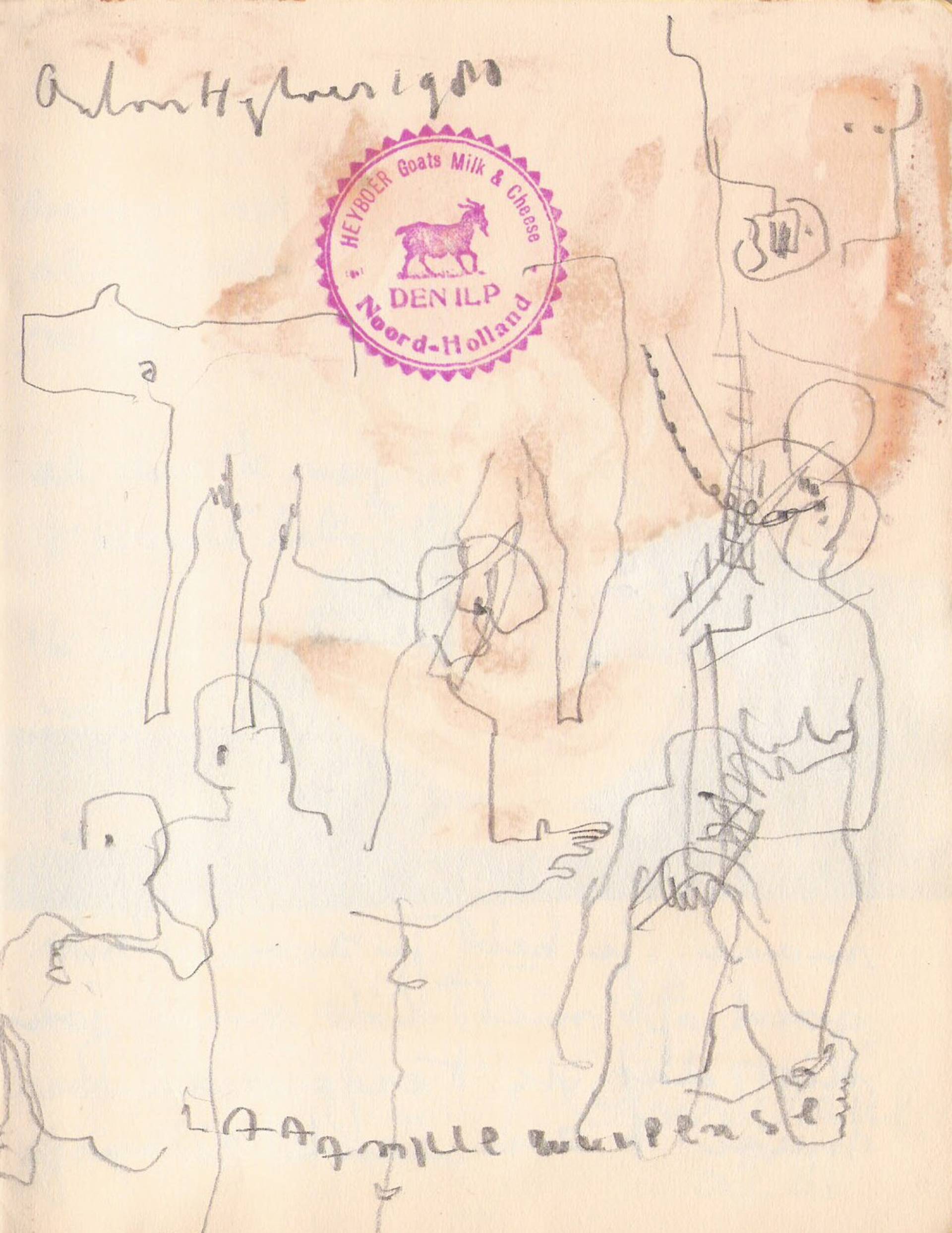 De moeder van Petra vertelde dat zij eerst zelf een relatie met Anton Heyboer had gehad, waarna zij Petra aan hem voorstelde. Anton kwam, nadat zij hem gevraagd had, in zijn Range Rover met zijn bruiden naar het hotel. Op de foto zijn ze net aangekomen, zijn bruiden zitten met de moeder van Petra op de motorkap. De bijdrage van Anton is een passage uit een groot schilderij dat hij in die periode heeft gemaakt. Dit schilderij, “La famille qui pense”, wordt beschreven in het boek dat zijn tweede vrouw Erna schreef over haar leven met hem. Hij heeft een stempel van Den Ilp in het werk gezet, een grappig detail.