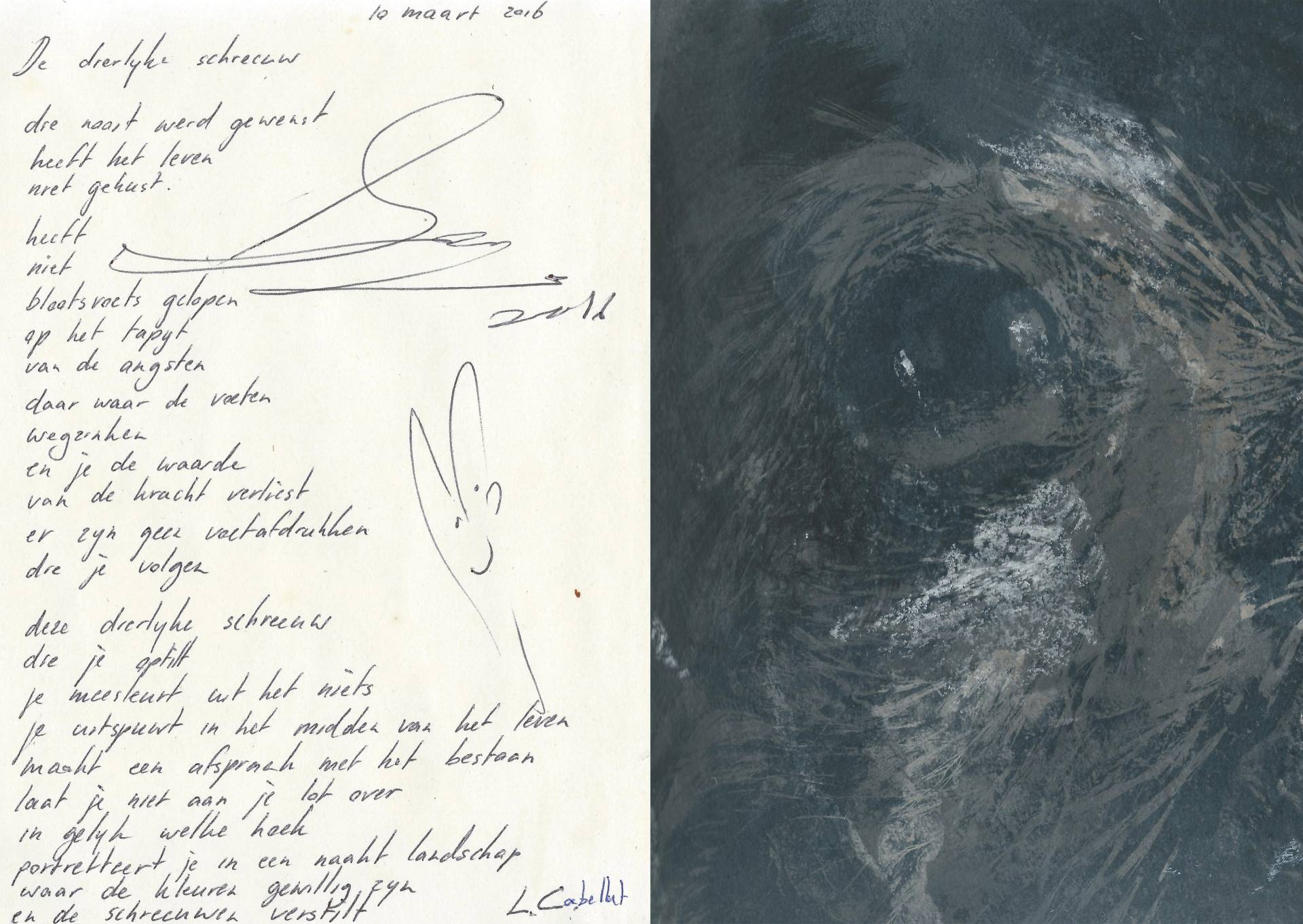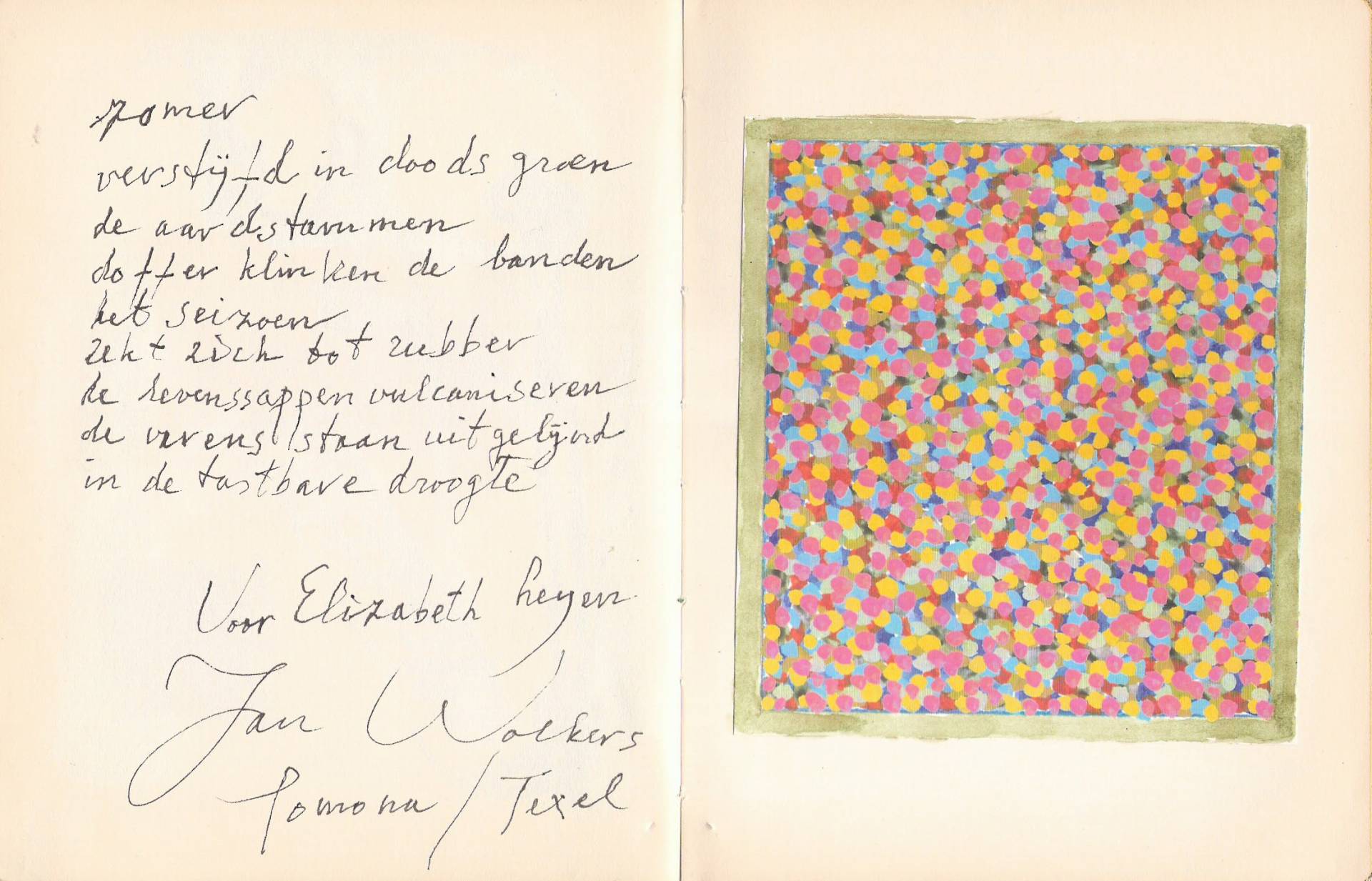 Helaas is het mij niet gelukt Lucebert een bijdrage in mijn album te laten maken. Ik heb bij hem aangebeld maar zijn vrouw riep een huisvriend van hen naar de deur. Ze zei; ‘Mijn man is op vakantie, maar Bert kan wel iets voor je schrijven.’ Bert Schierbeek was aangesloten bij de Cobra Groep en redacteur van het tijdschrift ‘Het Woord’. Hij schreef een prachtig gedicht in mijn album met de titel; ‘De kracht van ontspannen water’.